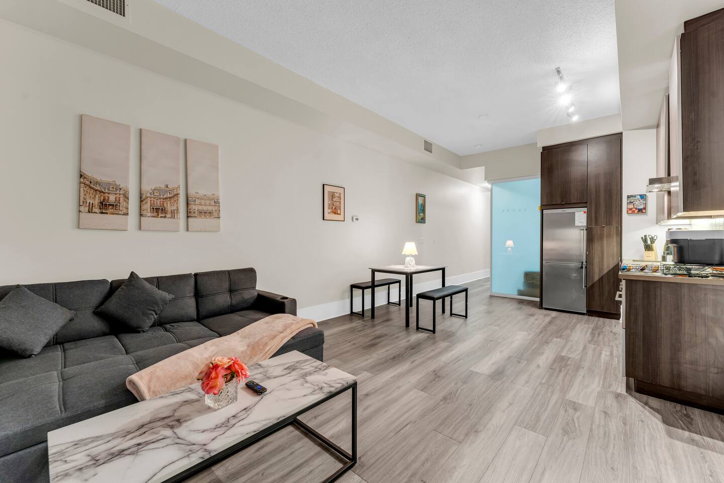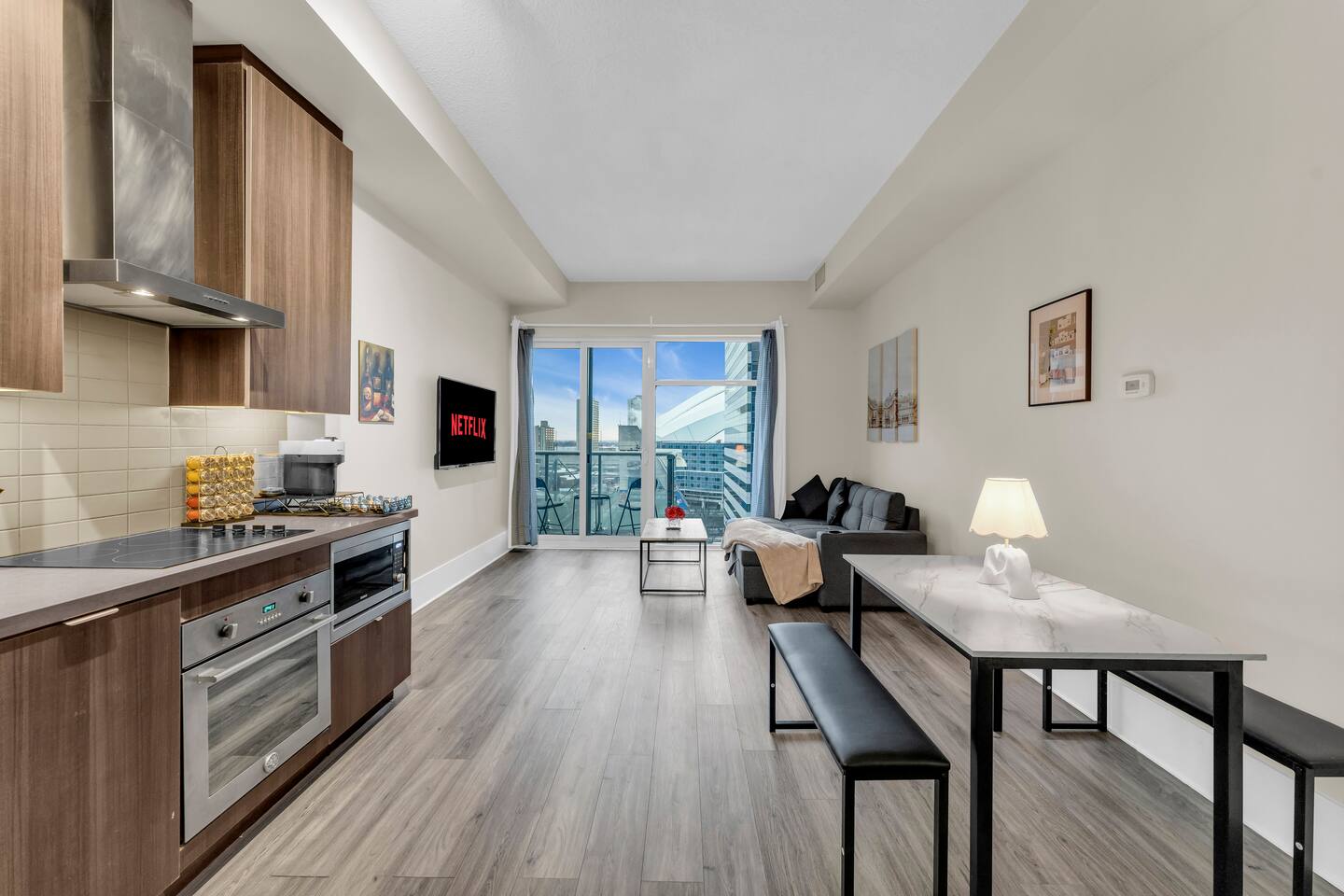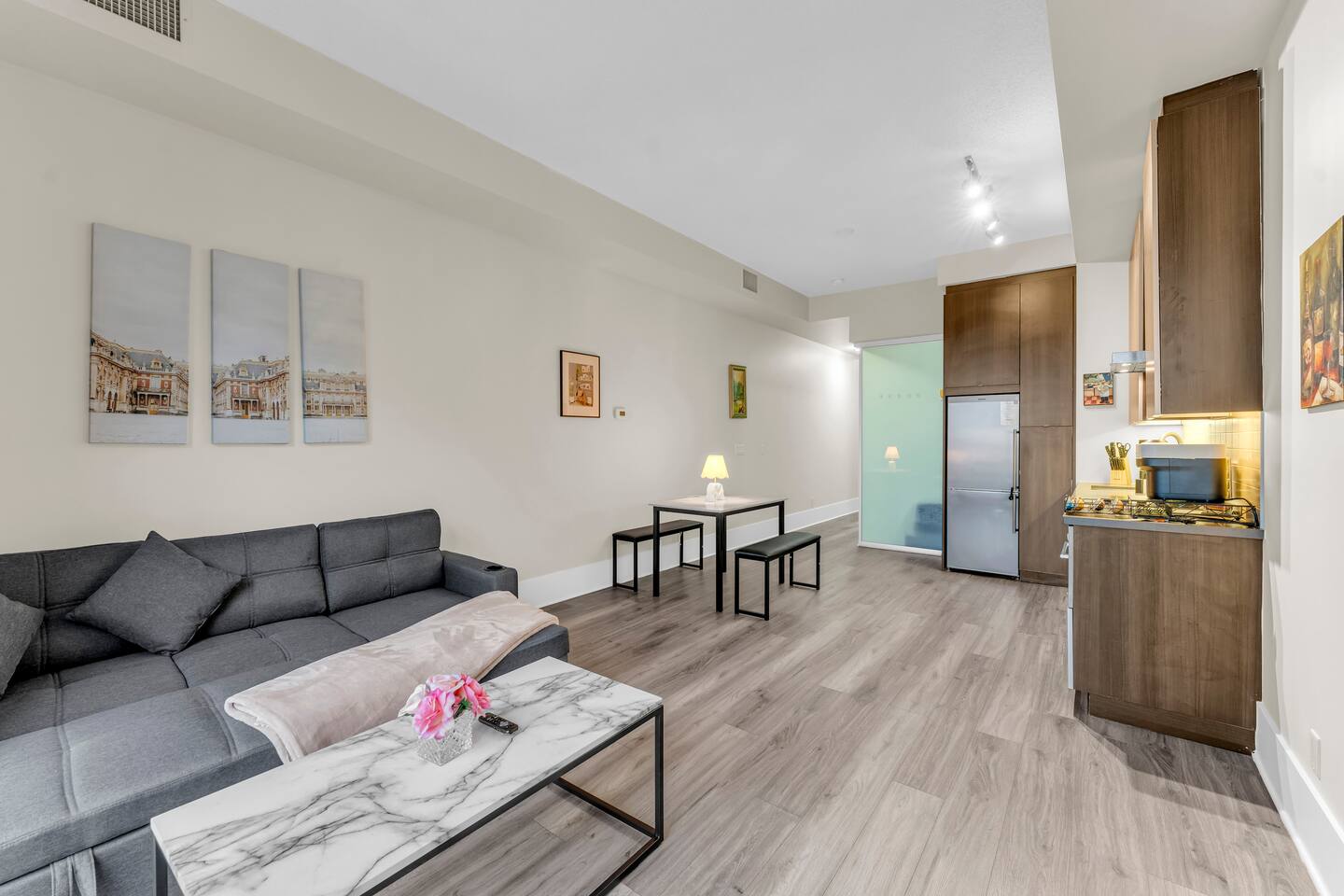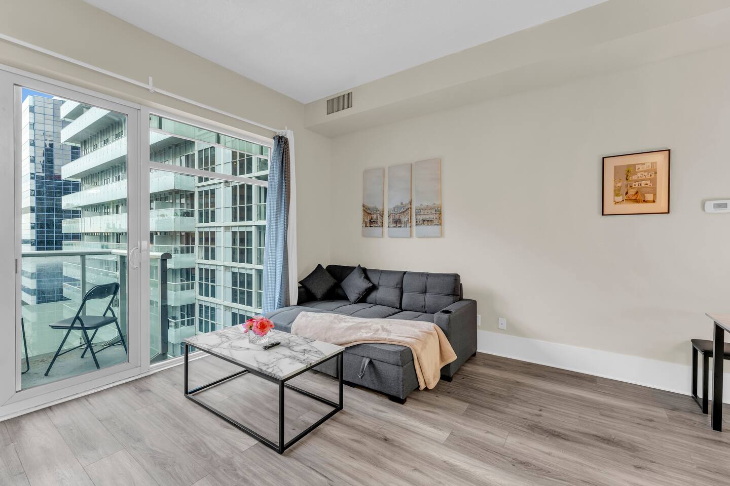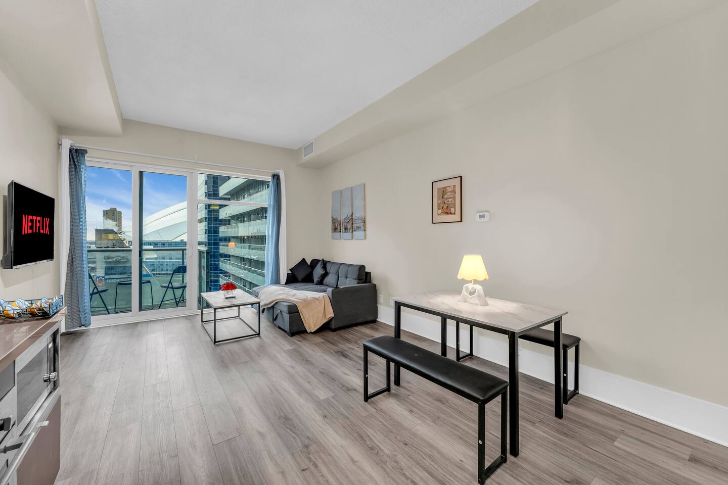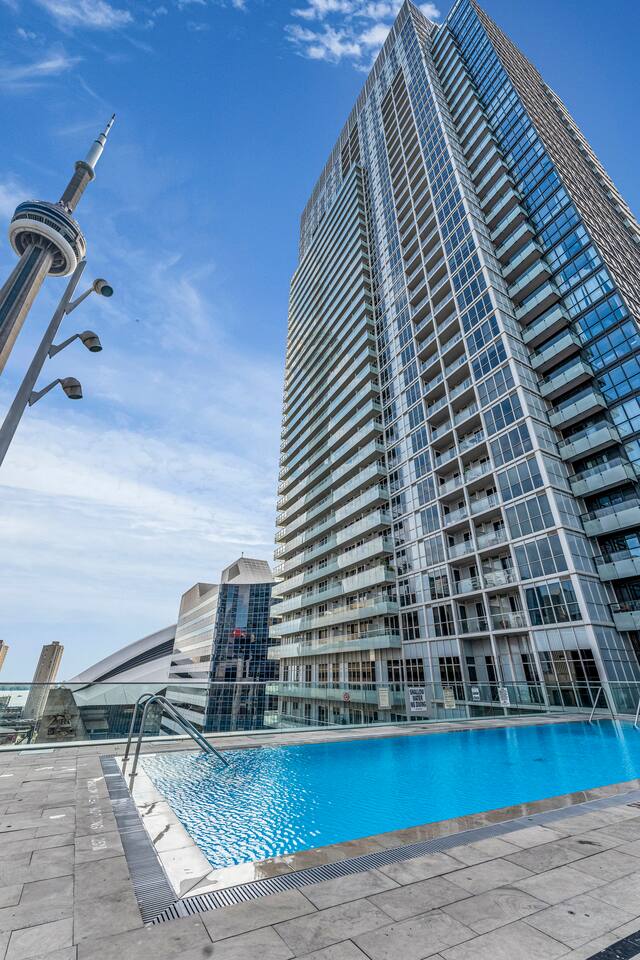 Stay in the heart of Toronto in this modern, upscale condo—perfect for couples, solo travelers, or small groups. Ideal for 2 guests but comfortably accommodates up to 4. ✔ 1 Bedroom with a Queen Bed ✔ Double Sofa Bed in Living Room ✔ Fully Equipped Kitchen & Dining Area ✔ 10 ft Ceilings & Fast Elevators ✔ High-Speed Wi-Fi & 40" HDTV ✔ Access to Building Gym & Pool