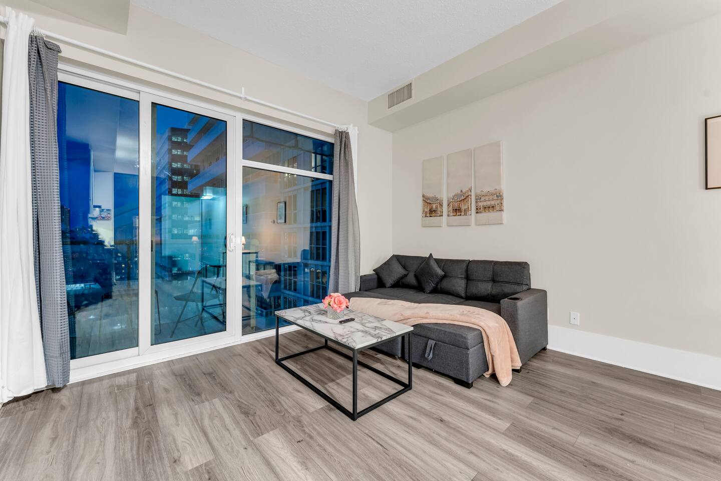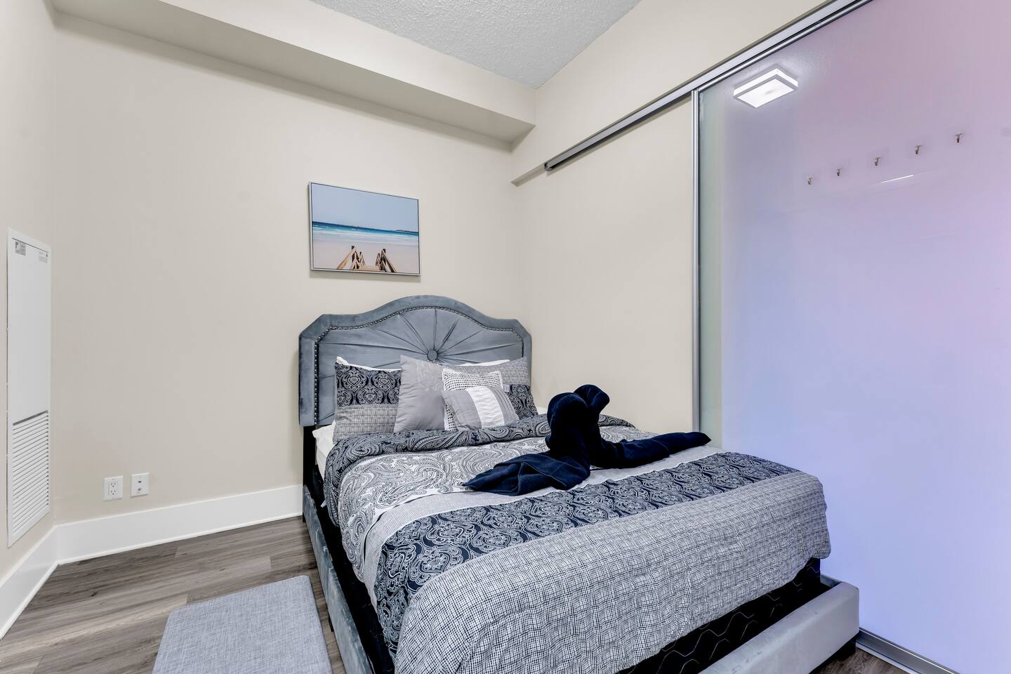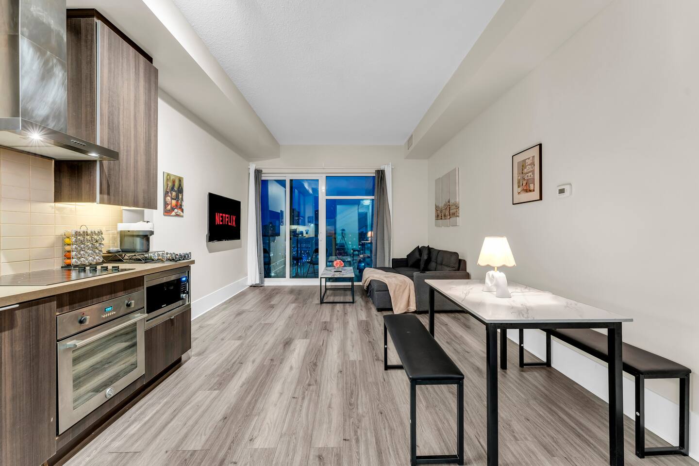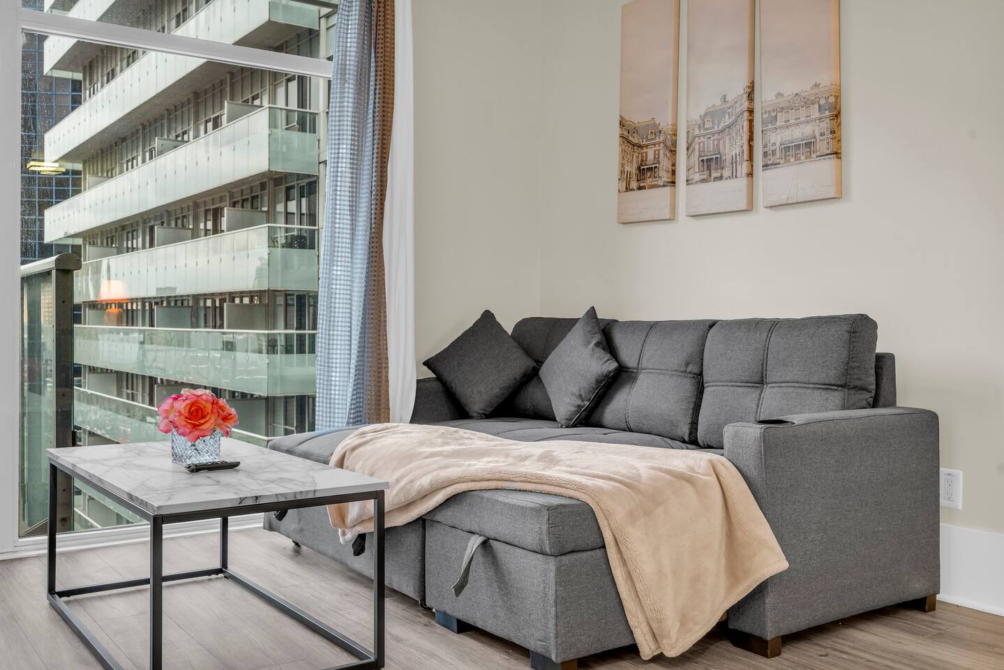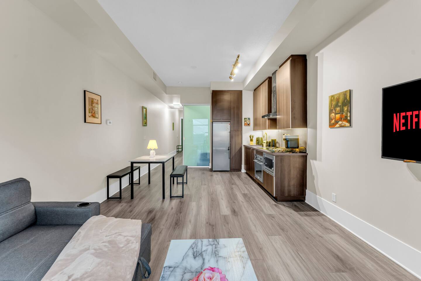Stay in the heart of Toronto in this modern, upscale condo—perfect for couples, solo travelers, or small groups. Ideal for 2 guests but comfortably accommodates up to 4. ✔ 1 Bedroom with a Queen Bed ✔ Double Sofa Bed in Living Room ✔ Fully Equipped Kitchen & Dining Area ✔ 10 ft Ceilings & Fast Elevators ✔ High-Speed Wi-Fi & 40" HDTV ✔ Access to Building Gym & Pool