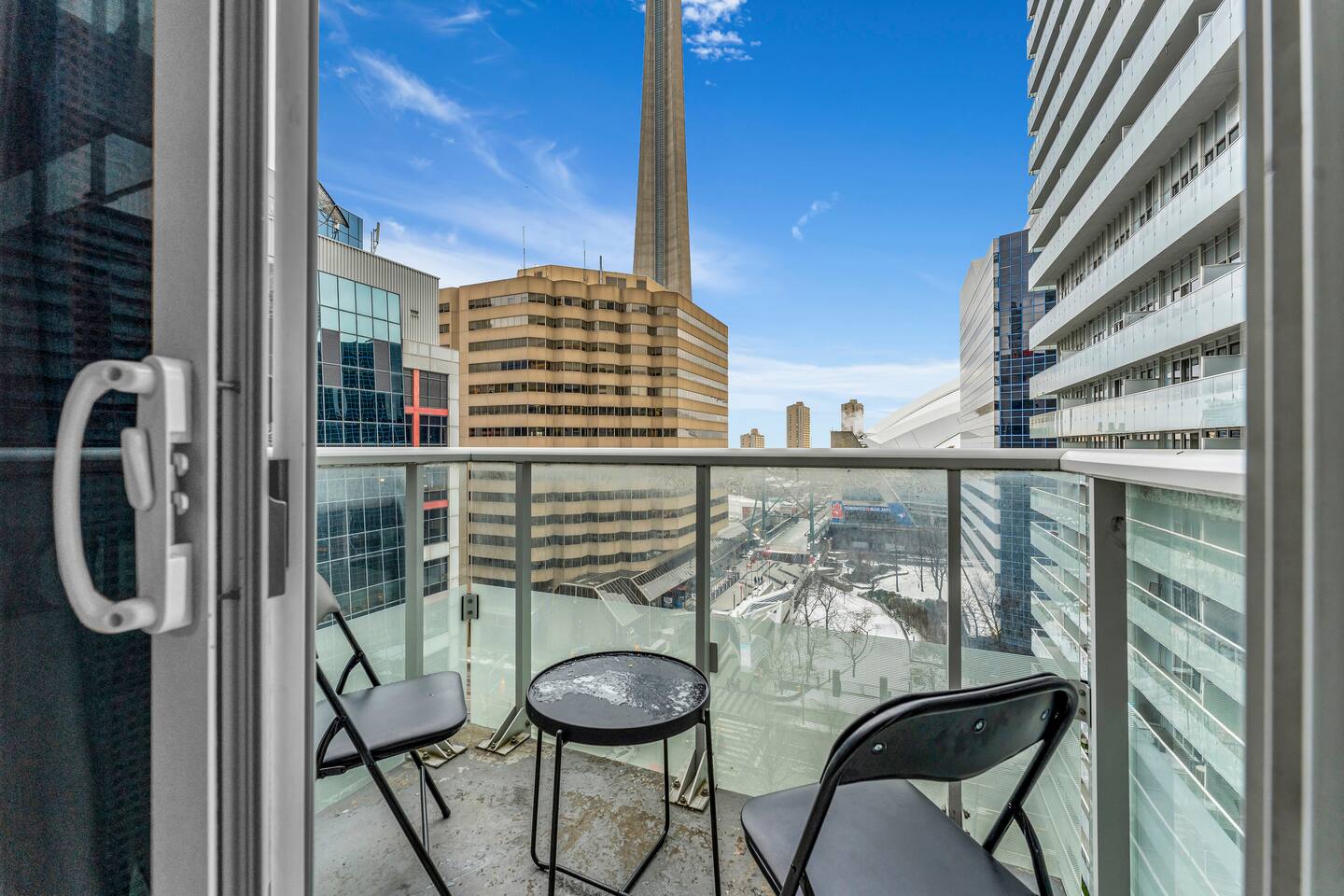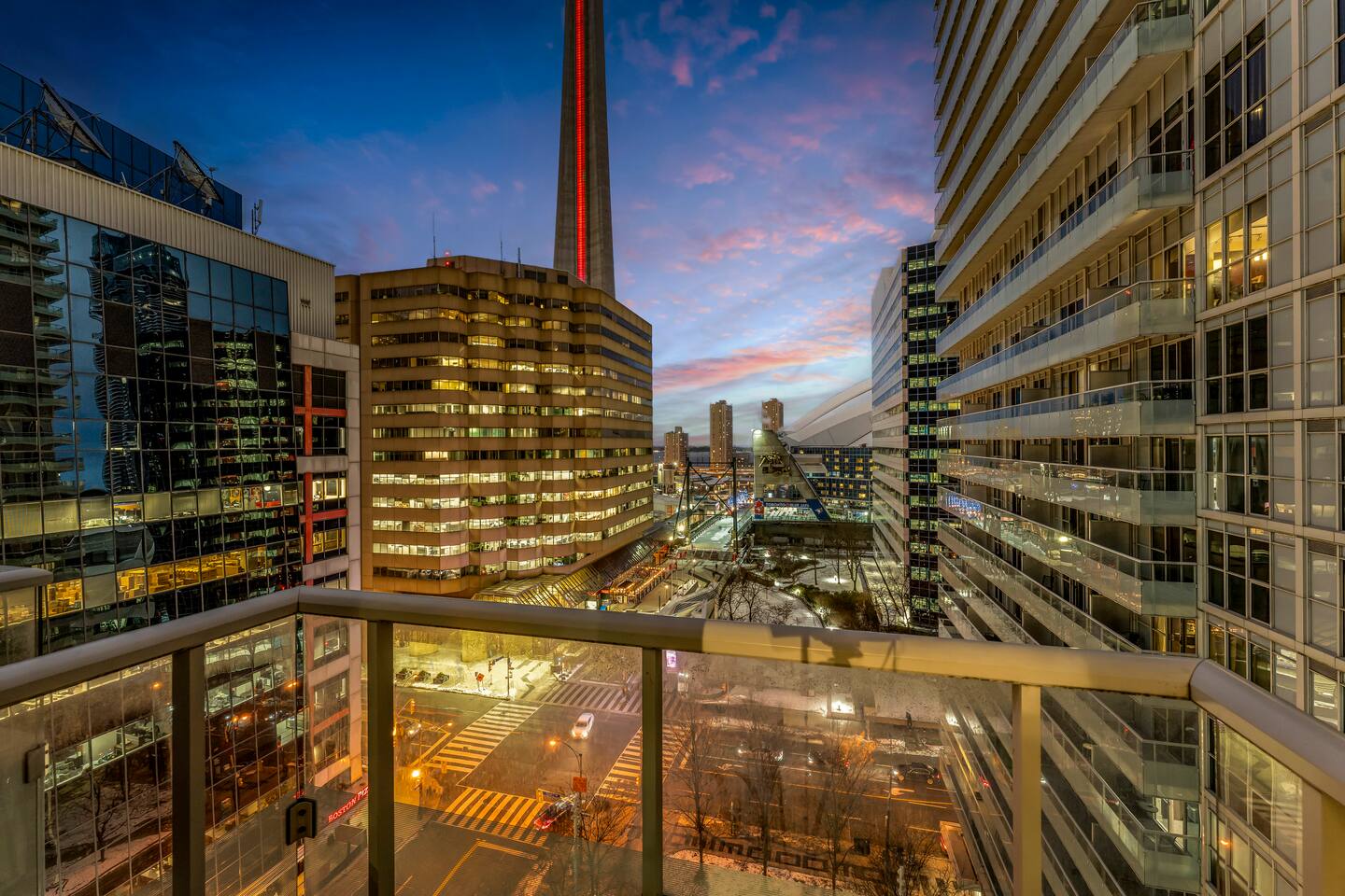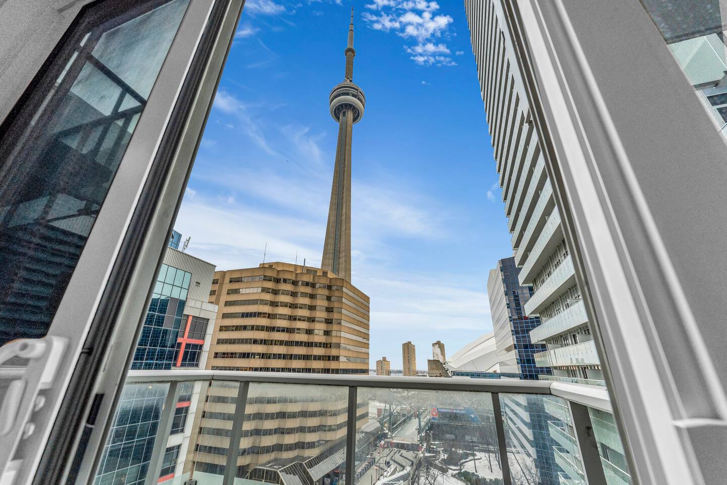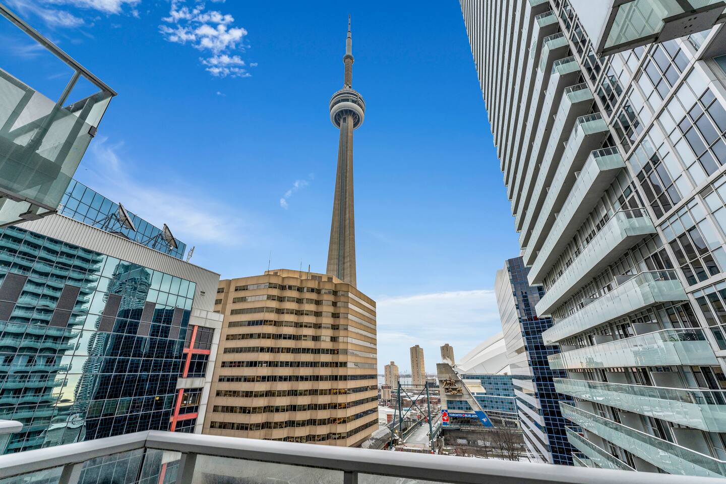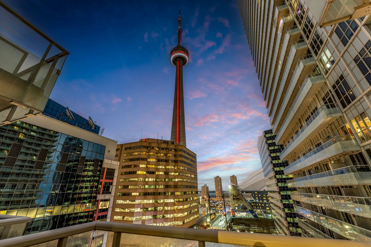 Walk times; CN Tower - 1 min. Rogers Centre - 2 mins Aquarium - 3 mins Convention Centre - 4 mins Union Station - 8 mins Scotiabank Arena - 8 mins Toronto island ferry - 10 mins.
